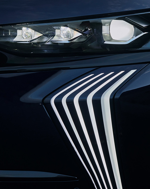 Versterkt door DS PIXEL LED VISION 3.0 en DS LIGHT VEIL, bezorgt de lichtsignatuur de DS 7 een scherpe, onvergetelijke look. Onze hightech koplampen in combinatie met de grille benadrukken de elegantie van de voorzijde.
